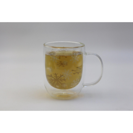 Double-wall glass cup with snowflakes decorated, for latte, cappuccino, tea, beverages, coffee