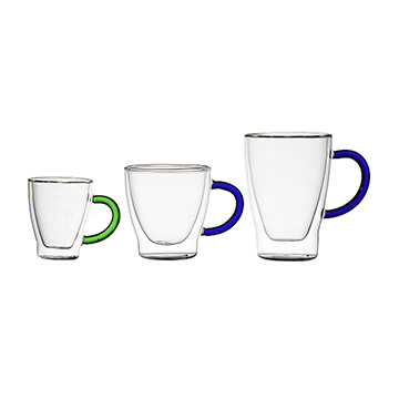 Borosilicate glass tea cup/coffee mug, double wall and with color handle