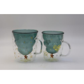 Christmas tree double wall glass cups with snowflake decorations, for hot beverages, tea, milk, juice