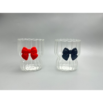 Glass cup decorated with bows, cute glass tumbler for juice, beverages, soda, coffee, restaurant, kitchen, party, office