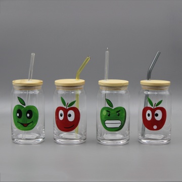 Sippy cups with hand-painted apple designs, wooden lids, cold drink glassware