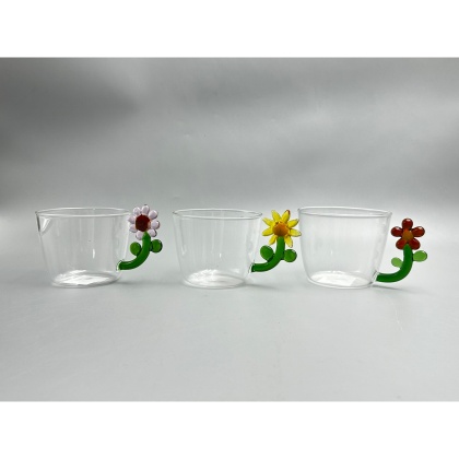 Glass cup with floral decorations on the handle, for juice, beverages, soda, coffee, restaurant, kitchen, party, office